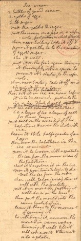 Ice cream was first invented in the seventeenth century as a dish for kings. Beginning in the eighteenth century, English cookbooks included recipes for ice cream, starting in 1718 with Mrs. Mary Eales, the royal confectioner to Queen Anne. Recipes contained advice about how best to freeze the cream mixture to create ice cream. Mrs. Elizabeth Raffald’s cookbook of 1775 says to set the mixture: “in a tub of ice broken small, and a large quantity of salt put amongst it, when you see your cream grow thick round the edges of your tin, stir it, and set it in again till it grows quite thick, when your cream is all froze up, take it out of your tin, and put it into the mould you intend it to be turned out of, then put on the lid, and have ready another tub with ice and salt in as before, put your mould in the middle, and lay your ice under and over it, let it stand four or five hours.”